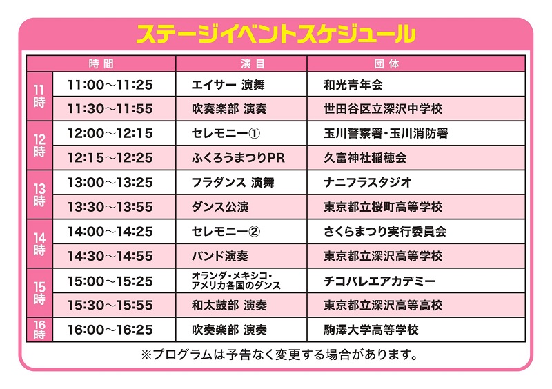 ステージでは、深沢中学校の吹奏楽部、深沢高校のバンド、和太鼓部の演奏、桜町高校のダンス公演をはじめ、和光青年会のエイサー演舞、地元のフラダンス、バレエ教室のパフォーマンスを用意。